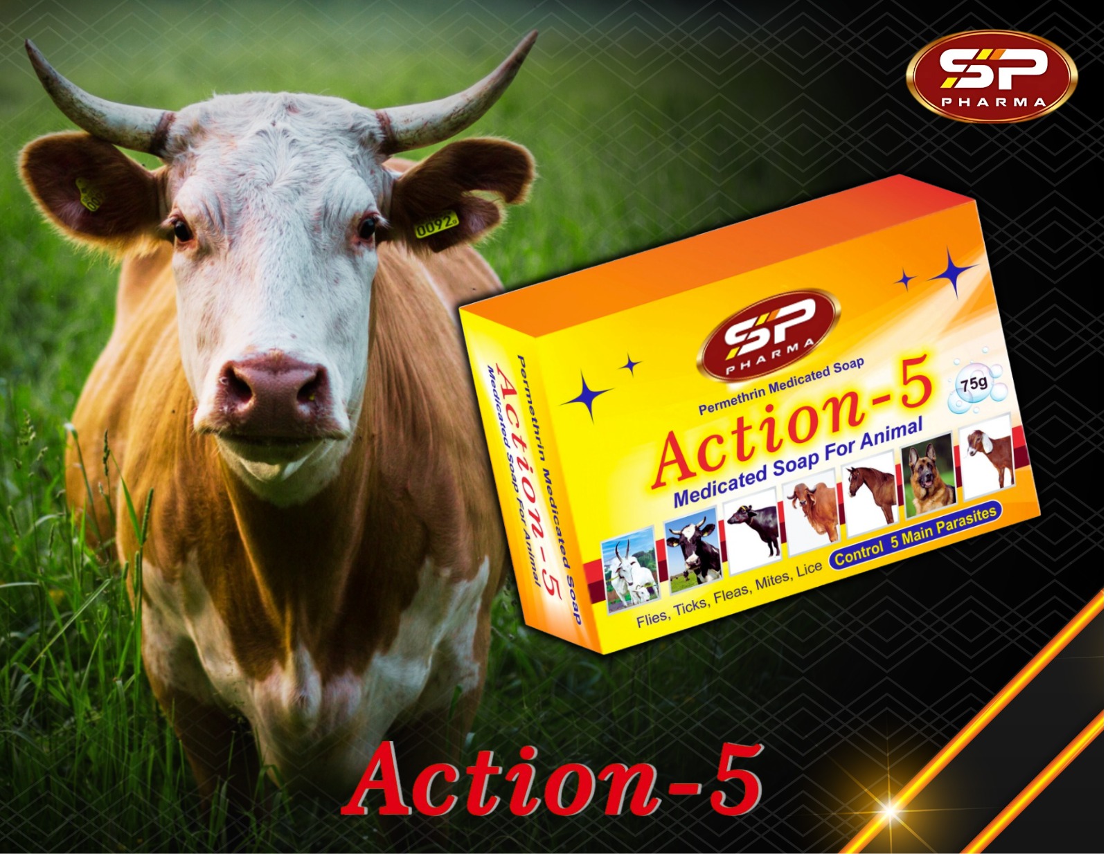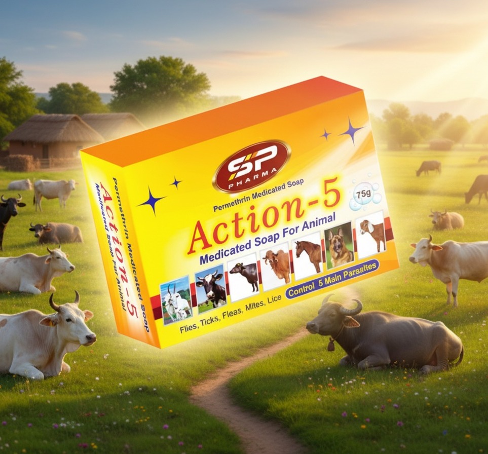 Located at Main Road, Vasagade, Sangli, SP Pharma specializes in Action 5 Soap. This powerful veterinary product helps control flies, ticks, mites, lice, and mosquitoes on animal and pet bodies. With just one application, it protects animals from parasites for at least seven days. Farmers, pet owners, and livestock caretakers rely on this soap to ensure better hygiene and comfort. The product reduces infections, prevents itching, and improves overall skin health for pets and cattle. SP Pharma maintains genuine quality supplies and ensures customers receive proper guidance on safe and effective use.